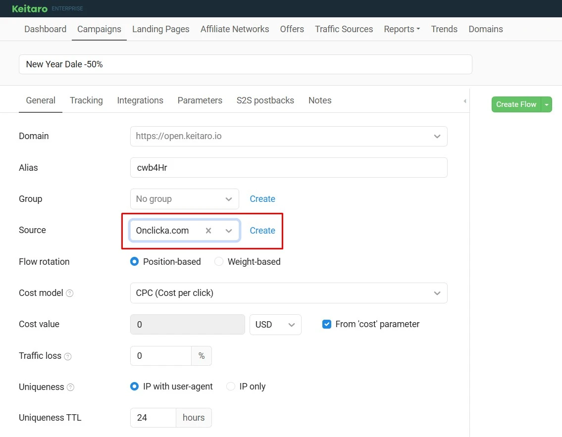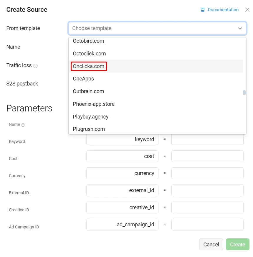 In the Source field, select OnClicka. All necessary parameters, like the S2S Postback URL and Parameters, will be filled in automatically.