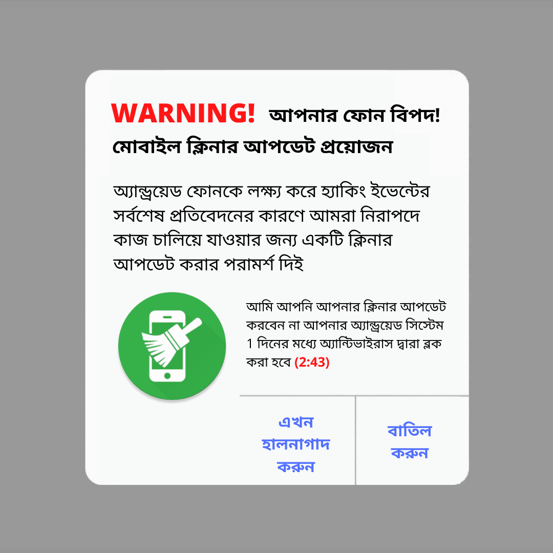 I continued to improve my push notifications to increase click-through rates. I included a different icon and detailed text about the threat to the user's device, along with a timer to encourage the user to click the update button. I kept the alarm sound but removed the danger sign.